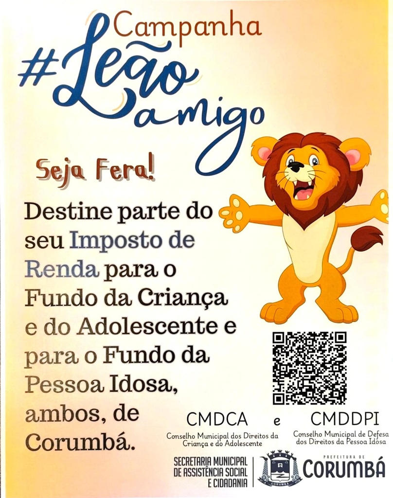 A Prefeitura de Corumbá, em parceria com os conselhos municipais de defesa dos direitos da pessoa idosa e da criança e do adolescente, promove na sexta-feira, 27 de março, uma reunião estratégica para fortalecer a campanha de destinação do Imposto de Renda conhecida como ‘Leão Amigo’. O encontro será realizado das 09h às 10 horas, no auditório do Paço Municipal.